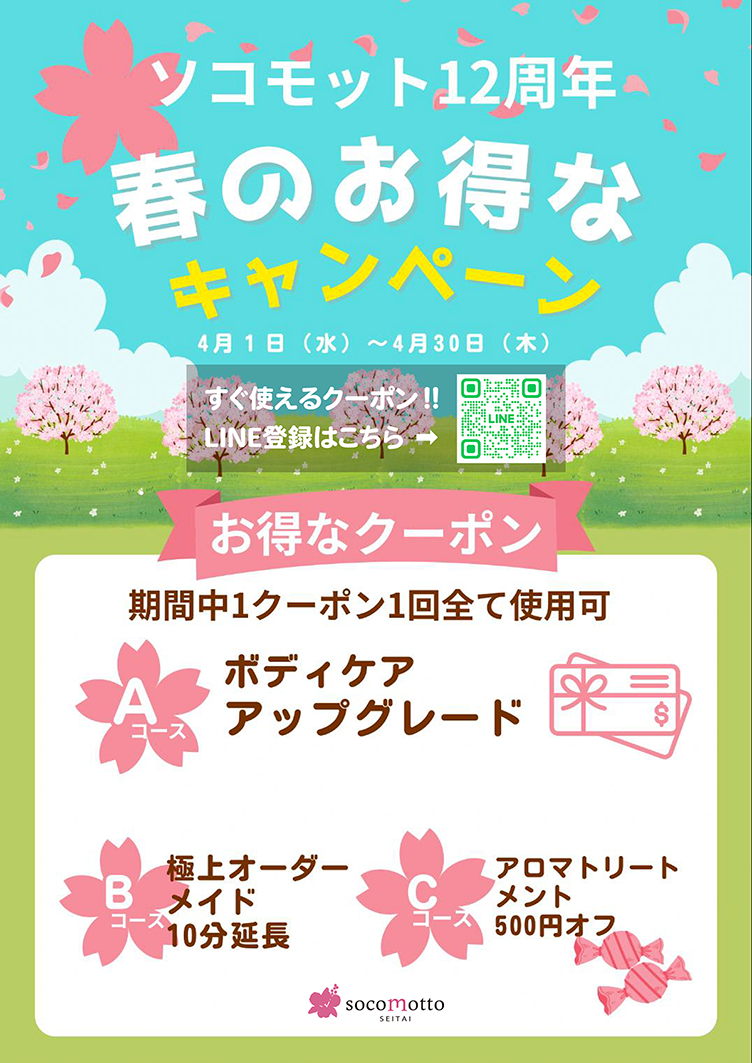 おかげさまで整体ソコモットは、4月7日に12周年を迎えることとなりました。